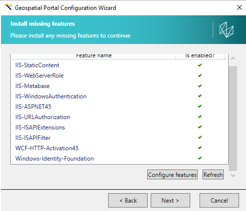The wizard searches for installed system features and components. When completed, a screen with a list of all installed or missing features will be shown. In case all required features are enabled, click Next. In case there are some missing system features, configure them and then click Next.