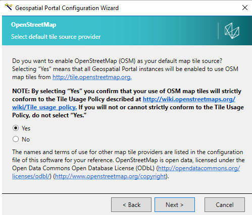 Decide whether you want to enable OpenStreetMap as your default map tile source. If you select Yes, all Geospatial Portal instances will be enabled to use OSM map tiles.